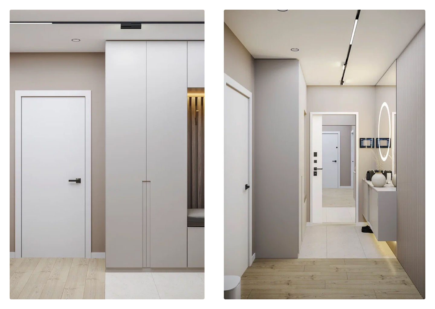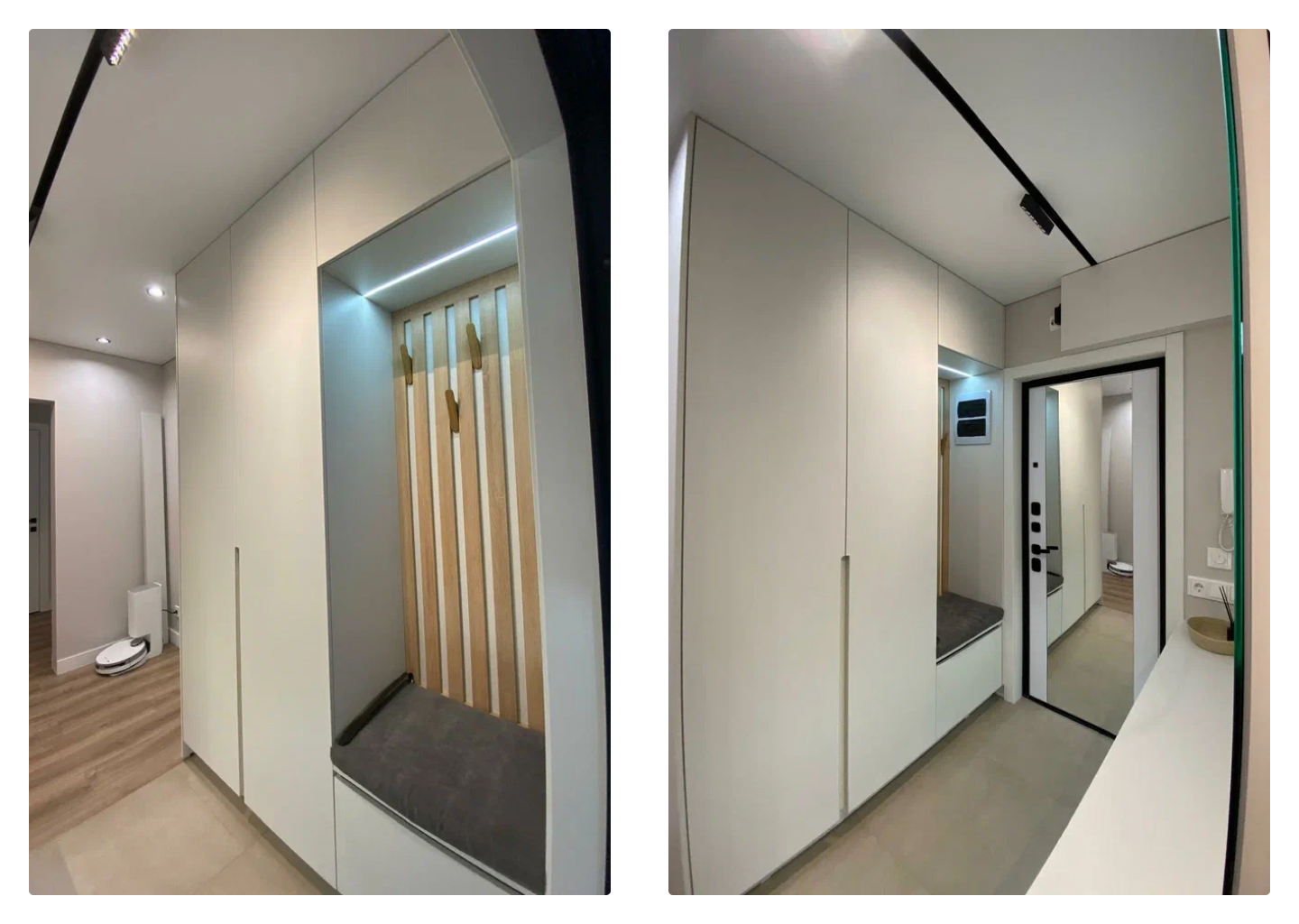 В прихожей расположился вместительный шкаф и открытая вешалка. А еще большое зеркало с необычной подсветкой. В зоне у входа сделали теплый пол, чтобы ногам было комфортно и обувь сохла быстрее.