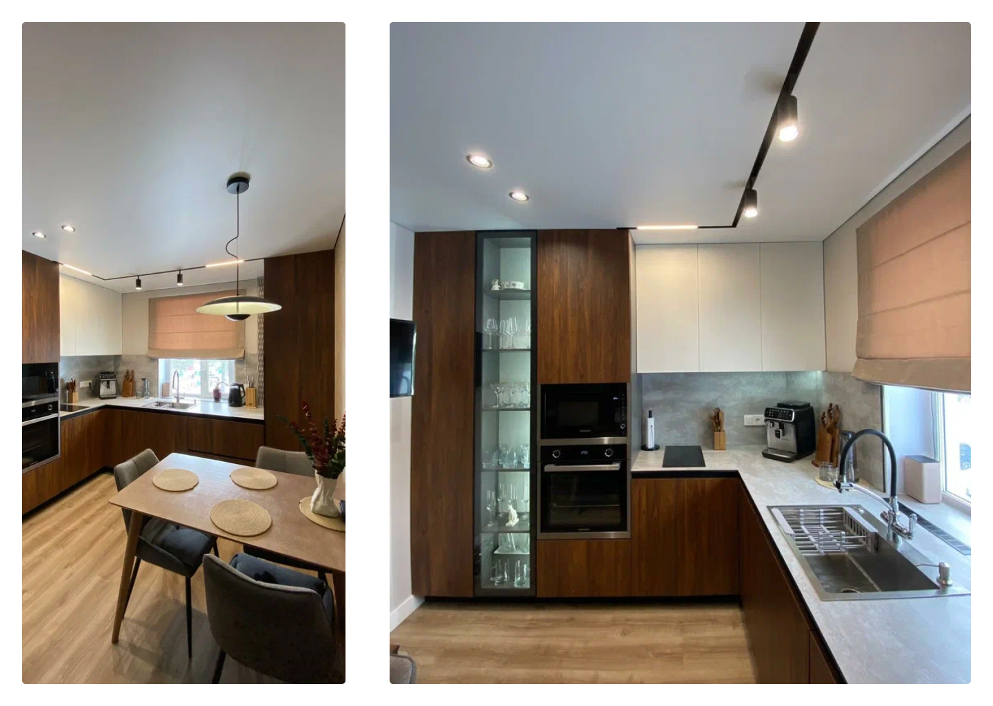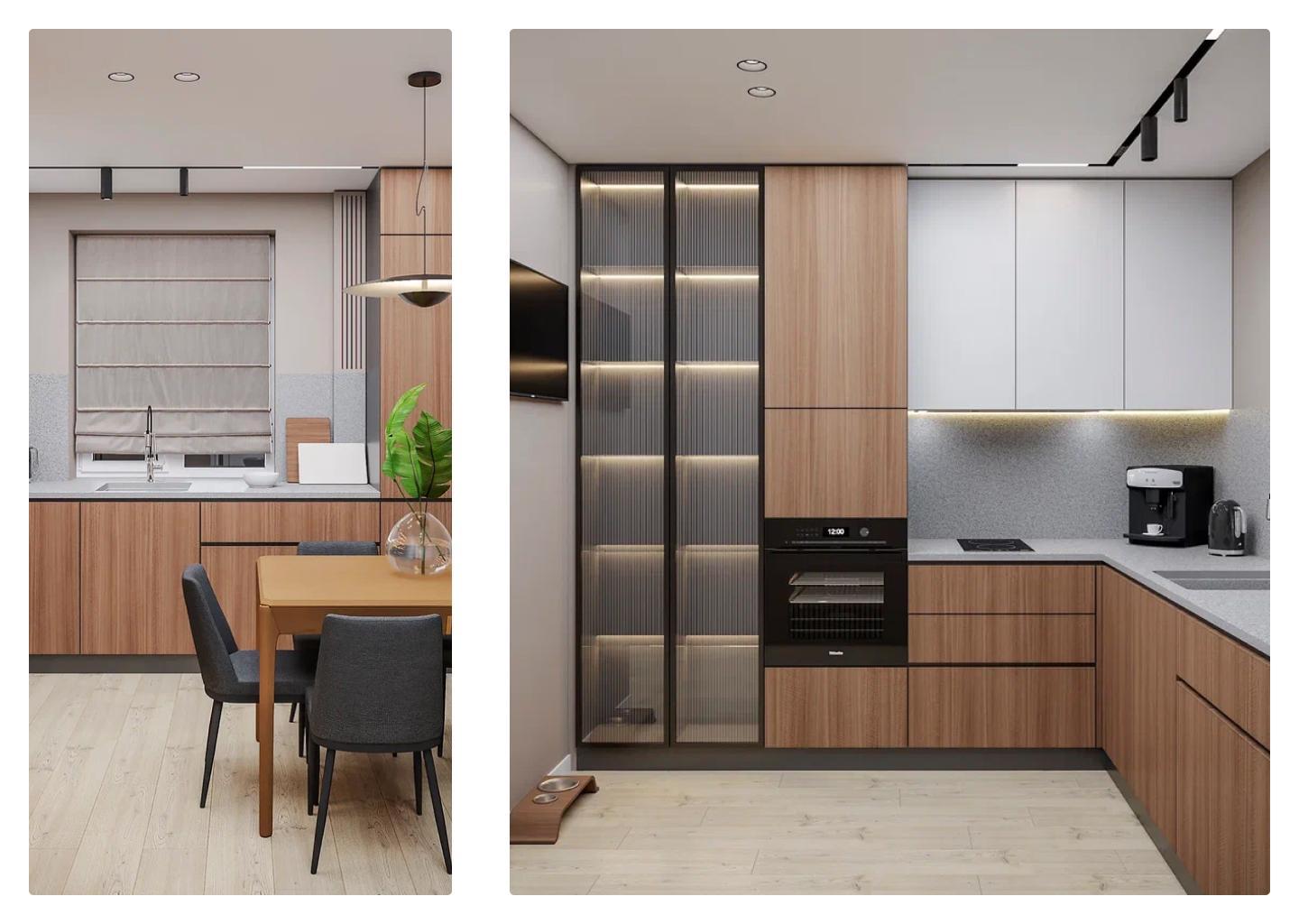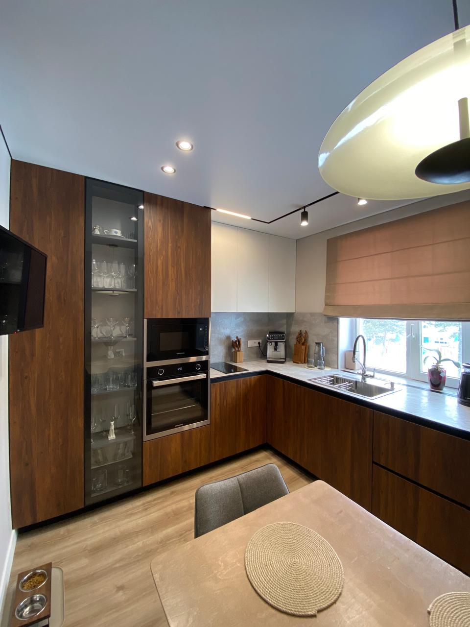 Кухня – это главная изюминка и гордость этого проекта. Мойку перенесли под окно. Вентиляционную шахту спрятали за красивым шкафом со стеклянными дверцами. Технику расположили в пеналы с двух сторон. А над столом повесили красивый светильник. И даже полноценный стол вместился.