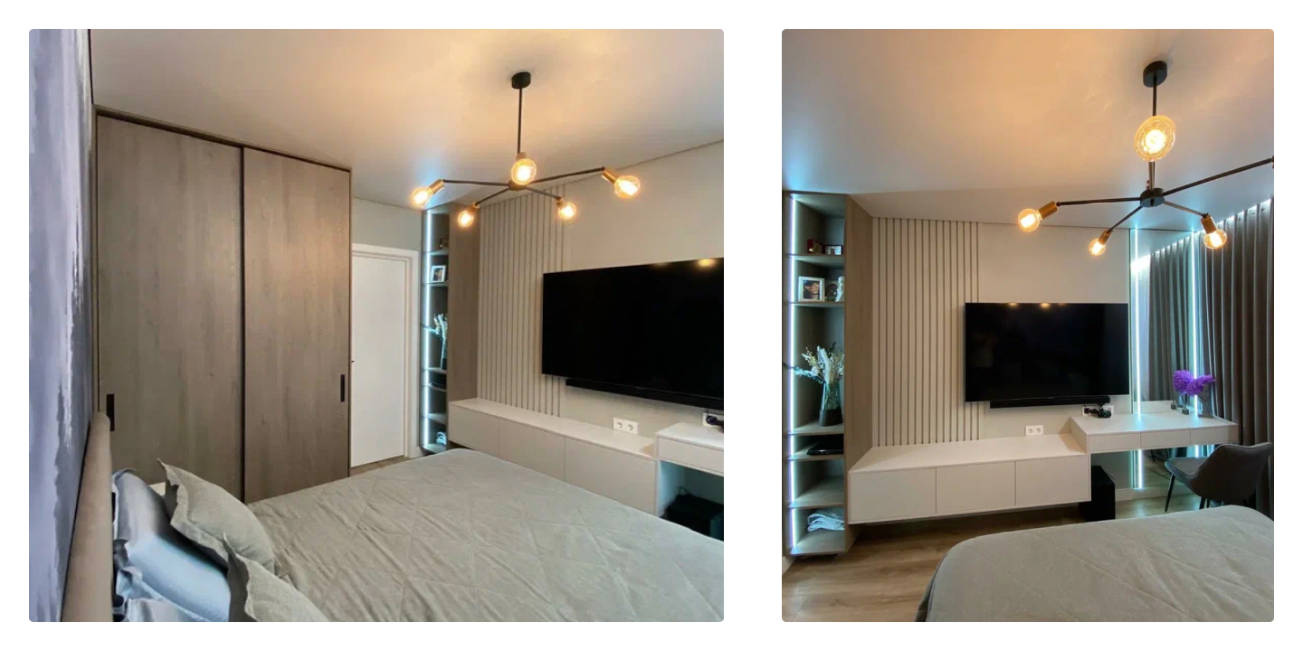В спальне кроме кровати и шкафа удалось разместить книжный шкаф и туалетный столик с большим зеркалом. И конечно не обошлось без функциональных светильников и фрески за изголовьем кровати.