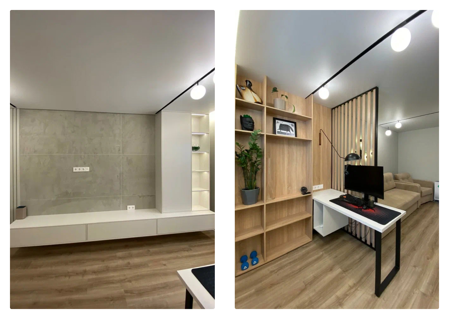 Гостиная разделена на рабочую зону и зону отдыха. Стена за телевизором выполнена из декоративной штукатурки под бетон. На потолке магнитный шинопровод со светильниками в виде шаров (заказчики их особенно оценили). Естественно, зонные подсветки и разные сценарии освещения.